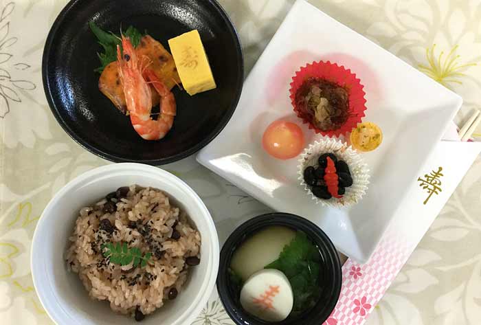 【お品書き】赤飯/甘鯛うに焼き/えび焼き/黒豆/サーモンムース/寿玉子焼き/松前漬け/葛りんご/お雑煮