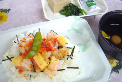 エビ、イカ、イクラののった海鮮ちらし寿司。リンの多いイクラは小さじ1杯なら安心です。
